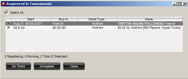 Усовершенствованное окно диалога по регистрации в турнирах (Registered in Tournaments, вызывается по нажатии горячих клавиш CTRL+R). Теперь можно не только посмотреть более подробную информацию о тех турнирах, в которых вы зарегистрировались, но и отозвать регистрацию изо всех не начавшихся, если вам вдруг резко поплохело, например. Мало ли.
