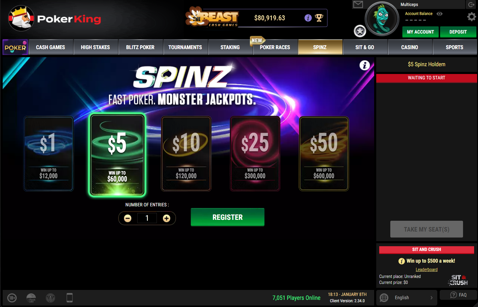Sit&Go можно найти в одноимённой вкладке, формат часто используется для различных сателлитов, например, во флагманский турнир PokerKing — $2,650 The Venom. Турниры пользуются в руме популярностью — после 20:00 МСК в будни в них можно игру с большинством бай-инов. Для SNG игроков есть отдельная гонка рейка «Sit&Crush» с выплатами от комнаты.