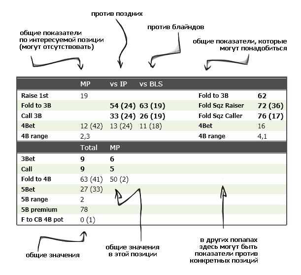 Верхний блок попапа, это когда оп - рейзер, нижний - когда оп сталкивается с рейзом, то есть стоит перед выбором, колить, 3бетить или фолдить.