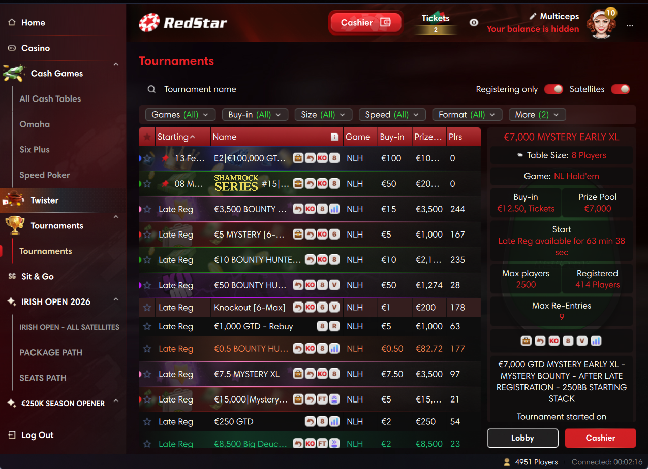 RedStar Poker — старейшая комната c большим выбором столов MTT и Cash, много акций и турнирных серий.