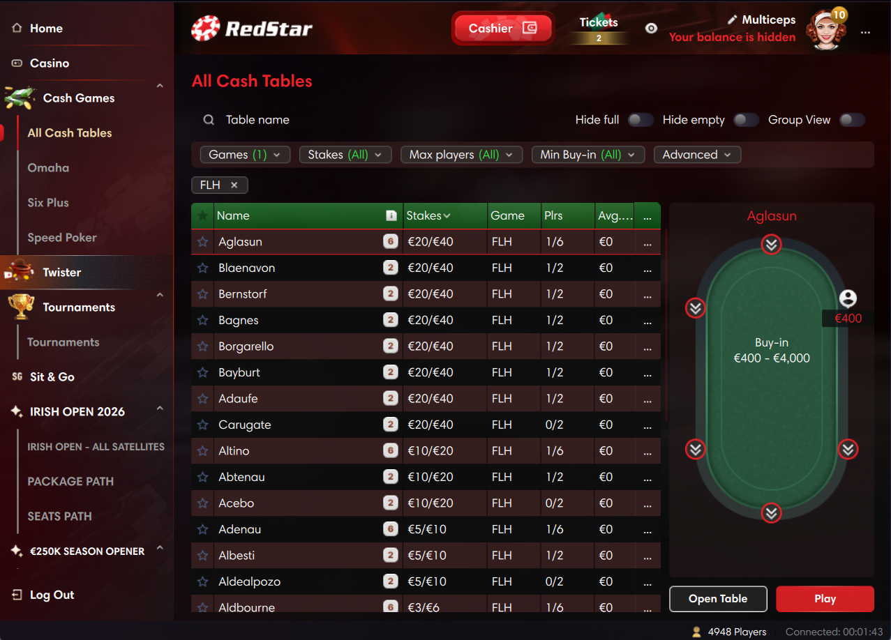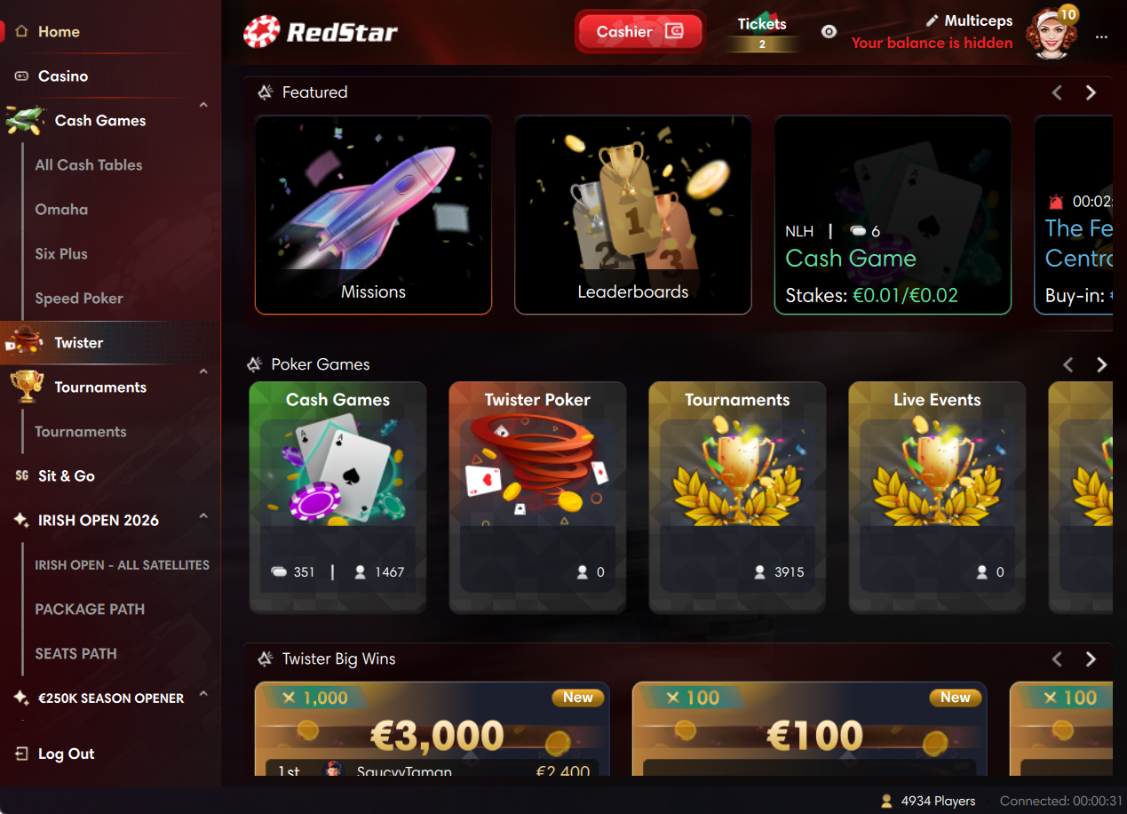 С 19 мая 2020 года RedStar Pokerработает в сети iPoker, которая входит в топ-20 площадок по кеш-трафику. Ежедневно в руме можно увидеть порядка четырех тысяч игроков — наибольшая активность с 22:00 МСК. Расчетная валюта рума — евро. На главной странице лобби есть блоки для быстрой посадки и доступа к основному фунционалу рума: