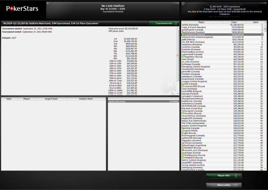 Вадим Курсевич из Беларуси занимает пятое место на WCOOP 2011 Main Event от PokerStars и выигрывает $750 000