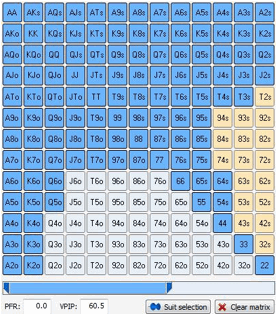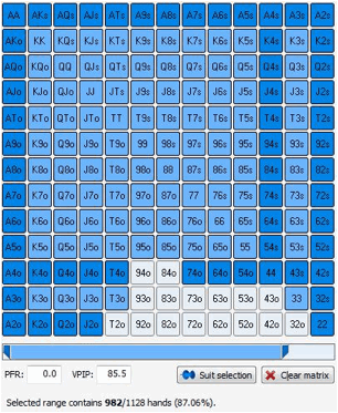 Какие могут быть диапазоны игроков после префлопа? Если был оупен-рейз, Герой сможет играть около 2/3 его стартовых рук. Лимп позволяет Герою играть больше рук, хотя самые мусорные руки всё же лучше фолдить. Я бы дал ему диапазон 85-90% от стартовых рук. BB должен рейзить большинство рук, у котороых больше 50% эквити против этого диапазона, хотя с некоторыми руками он может решить сыграть чеком, так как они могут быть более играбельны на постфлопе. У A2о 53,2% эквити против 85% диапазона Героя, чего было бы более чем достаточно для рейза в позиции. Топ 60% диапазона будет иметь около 54% эквити против 85% диапазона, что достаточно много. Однако с некоторым самыми слабыми разномастными тузами и королями BB, возможно, решит чекнуть, чтобы диапазон чека ВВ был сильнее на флопе с тузом или королём.