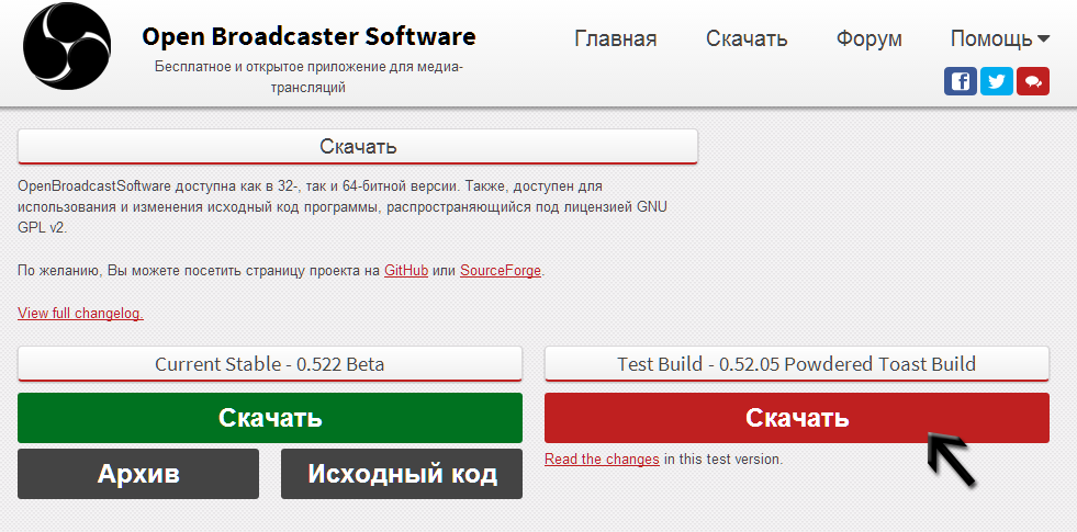 Скачиваем OBS по этой ссылке. Какую версию выбрать – стабильную или тестовую… я всегда выбирал тестовую за счет того, что очень часто добавляется новый функционал или проводятся оптимизации, значительно улучшающую работу программы. Но пока их не проверят, они не попадают в стабильную ветку, что занимает достаточно много времени. За все время использования тестовой версии OBS не сталкивался с критическими проблемами, которые бы не решались за очень короткий промежуток времени.