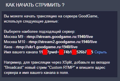 - Play Path/Stream Key – берется из настроек вашего канала на GoodGame.ru или на Twitch.TV (для GoodGame.ru, сначала зарегистрируйтесь, создайте канал в профиле и перейдите по ссылке http://goodgame.ru/channel/ВАШ_НИК/edit/ - увидите данные как на картинке, “имя вашего канала” то, что вам нужно вставить в Play Path/Stream Key)