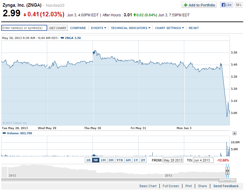 Данное известие в очередной раз обрушило и так не лучшие котировки акций Zynga на бирже NASDAQ. За 2 часа после анонса массовых увольнений, стоимость одной акции упала с $3,45 за штуку до $2,98 (-12,03%). Это не рекорд для зинги, которая уже падала до отметки в $2,13 за штуку, но худшее положение с марта месяца, когда Zynga объявили о сотрудничестве с bwin.Party и запуске Zynga Poker Plus.