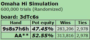 Это приводит нас к пот-лимитной омахе (PLO). Я долгое время не обращал особого внимания на PLO. Много слышал о том как весело и прибыльно в нее играть, но сам не пробовал до 2008 г., и заходил в нее больше для разнообразия (я много играл в холдем в то время). Я барахтался без особого понимания как нужно играть в эту игру, но начал постепенно получать какое-то представление о ней. Также заметил, что оппоненты часто совершают ужасные ошибки, и уровень игроков напомнил мне о холдеме “старых” времен.