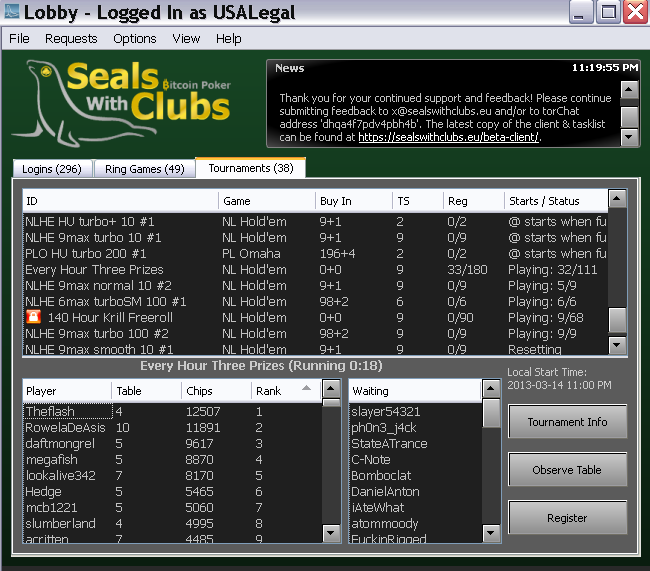Одним из наиболее популярных румов является Seals With Clubs. Конечно, если сравнивать его с легальными европейсками сайтами, то он покажется совсем крошечным: большую часть времени игра идёт за 10-20 кэш столами, в основном это безлимитный и лимитный холдем, а также PLO. Когда за столом находятся два или три игрока, появляется пятидесяти процентный рейкбек – инициатива, направленная на то, чтобы участники стартовали новые столы.