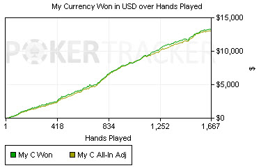 В первую очередь, стоит отметить, что данная рука должна быть для вас прибыльной. Карманные тузы ни в коем случае не должны находиться среди проигрышных рук в вашей базе статистики. Справа можно увидеть график автора данной статьи, показывающий его результаты с АА, которые в 1.5 раза выше, чем результаты с КК и примерно в 2.3 раза выше, чем его результаты с QQ…