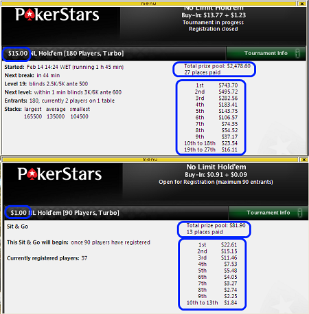 На этой неделе PokerStars внесли кое-какие существенные изменения в структуру призовых выплат своих Sit&Go-турниров на 90 и 180 человек. По завершении специального аудита менеджмент покер-рума принял решение расширить зону ITM до 27 человек в турнирах на 180 игроков (ранее призовых мест было лишь 18), а также до 13 в SNG на 90 участников (ранее - 12):