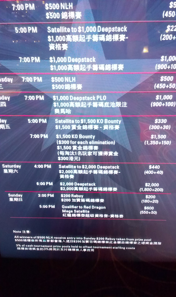 Я нашел покер-румы только в City of Dreams и в Wynn. Других не знаю. Хотя в инете упоминаются другие казино. Но после того, как я безуспешно искал PokerStars в Lisboa, интернету нужно доверять, но проверять. В PokerStars в районе часа дня начинается кэш игра. В это время можно сесть за стол свободно. До часа никого нет. Когда начинают играть в Wynn не знаю. Думаю, примерно также. Часам к 4 появляется очередь на столы. Админы покер-румов запишут вас. Если перед вами 4-5 человек, то придется вам погулять 1-1.5 часа. Очередь может быть и 10 человек. Причем уходить от покер-рума нельзя. В PokerStars объявят ваше имя в микрофон 3 раза. Если вас нет, то вы вычеркиваетесь из очереди и зовут следующего. Т.к. объявляют на ломанном английском, то вы можете и не понять, что зовут вас. Поэтому необходимо самому отслеживать движение в очереди. В Wynn немного более продвинутый сервис. Могут записать телефон и прислать смс, когда подойдет ваша очередь. В смс сказано, что нужно явиться в течение 10 минут. Так что тоже, особо далеко от казино не уйдешь. Очередь очень плохо поддается прогнозированию. В один день 5 человек пришлось ждать 1.5 часа. В другой день такая же по длине очередь прошла за 20 минут. Как-то раз в Wynn в 2 ночи сел играть вообще без очереди. Я применял такую тактику. Вставал в очередь в PokerStars и ехал в Wynn, вставал в очередь там, ехал назад в PokerStars. Оценивал обстановку. Шел ужинать в ресторан. Опять оценивал обстановку. Ну и т.д. Оно конечно муторно. Но после 6 часов игры в турнире было даже приятно покататься на такси туда сюда, развеяться.