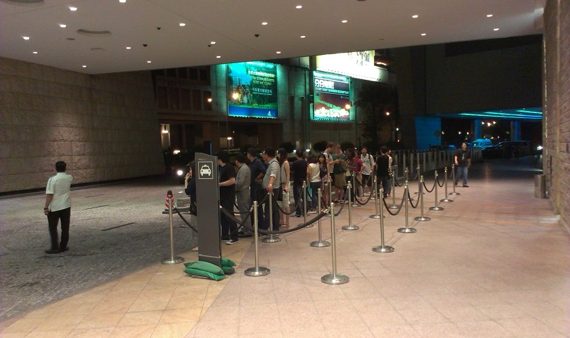 В Макао хорошо работает такси и нужно этим пользоваться. Цены умеренные: поездка минут 20 стоит 250 рублей. Такси не берут или редко берут пассажиров с дороги. Все садятся на такси на выходе из отеля. Есть специальное место, куда такси подъезжает. Там стоят люди в очереди и ждут. Например, вот эта очередь рассосалась за 5 минут, т.к. такси подъезжали каждые 30 секунд.