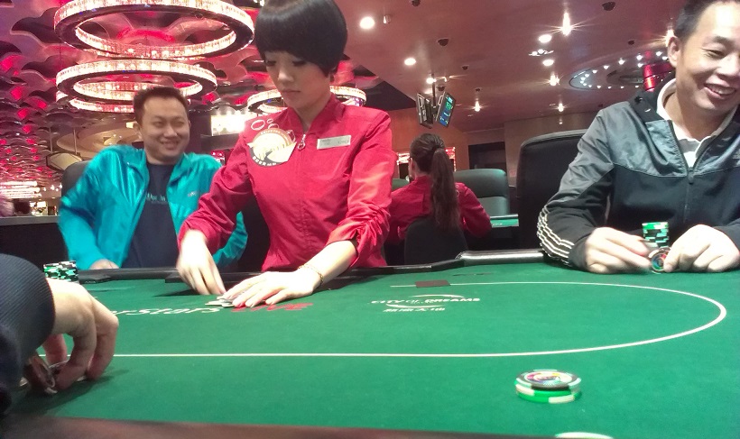 Вообще, я ожидал большего. Все довольно скромно и просто. В районе часа дня начинается кэш игра. До этого – пусто и тихо. Играет максимум 2 стола. Блайнды: 100/200 рублей. Довольно дорого для меня. Я бы предпочел играть по 25/25 или 25/50. Но деваться было некуда, т.к. я считал своим долгом отметиться в PokerStars LIVE. К счастью, дорогие блайнды компенсировались довольно слабым полем. При мне сел играть китаец, на вид – директор завода. Правила он не знал, выяснял их по мере игры. Колировал все. Долго выяснял, почему его 66 слабее A7, когда на борде лежал туз. Минут за 20 слил 50 тысяч рублей. Это его нисколько не расстроило, он отправился восвояси, играть в другие игры. Судя по всему, он и не собирался тратить на покер более получаса, для него это был, как очередной игровой автомат. И такие игроки там – не редкость. Есть чуть более продвинутые. Правила знают. Но могут начать пушить или колировать, попав в среднюю на борде карту. В отличие, например, от Киева, кэш игра на префлопе более сдержанная и классическая. Во флоп заходят 2-3 человека, а не 4-5 и более, как в некоторых других местах. В итоге за часов 5 игры я поднялся на 20 тысяч рублей. Макао начало мне нравится.