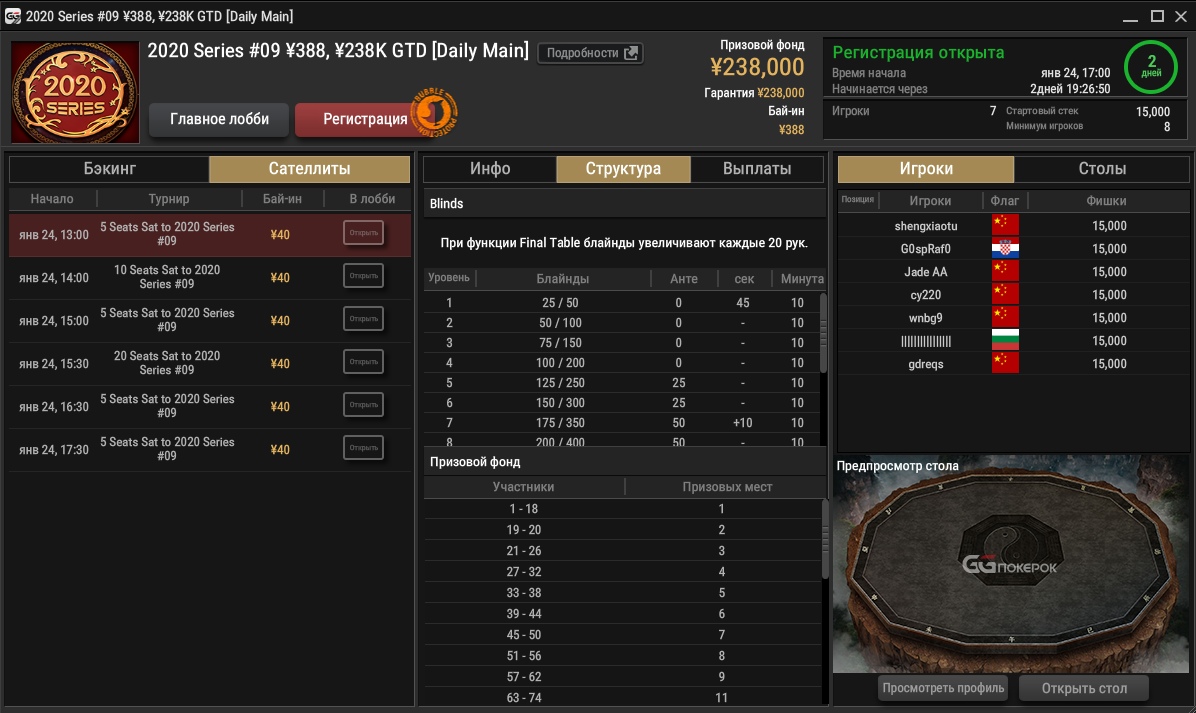 Серия будет состоять из нескольких групп турниров. Все бай-ины будут в юанях (¥). Символично, что бай-ин фазовых турниров составляет ¥2,020. И хотя серия официально еще не началась, фазовые турниры уже идут — вы можете найти их в лобби GGПокерОК в специальной вкладке.
