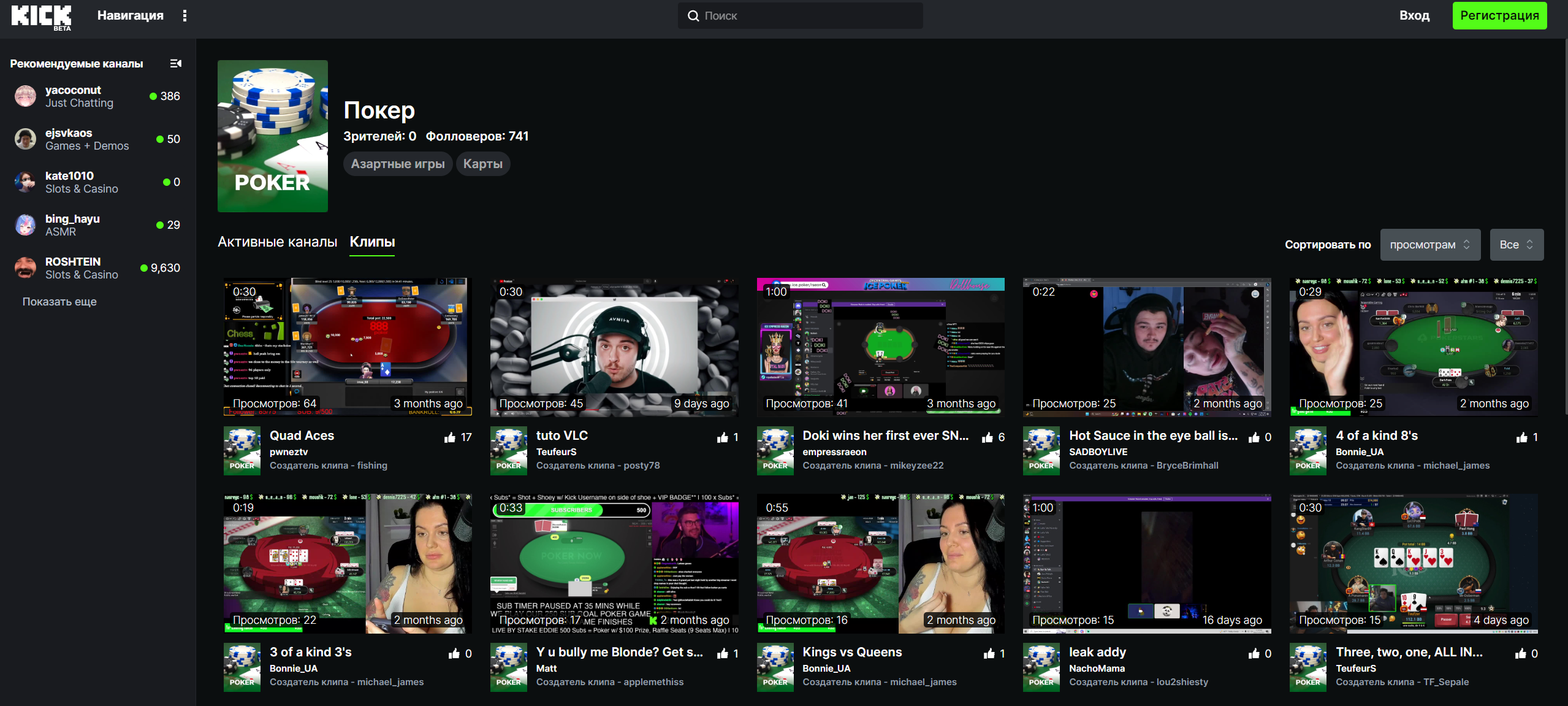 Некоторые известные стримеры покера уже попробовали себя на Kick, но пока эта категория не слишком популярна — у неё всего 741 фолловер, при этом в 16:00 МСК 15 июня 2023 зрителей не было, а на топовом клипе за всё время значилось лишь 64 просмотра.