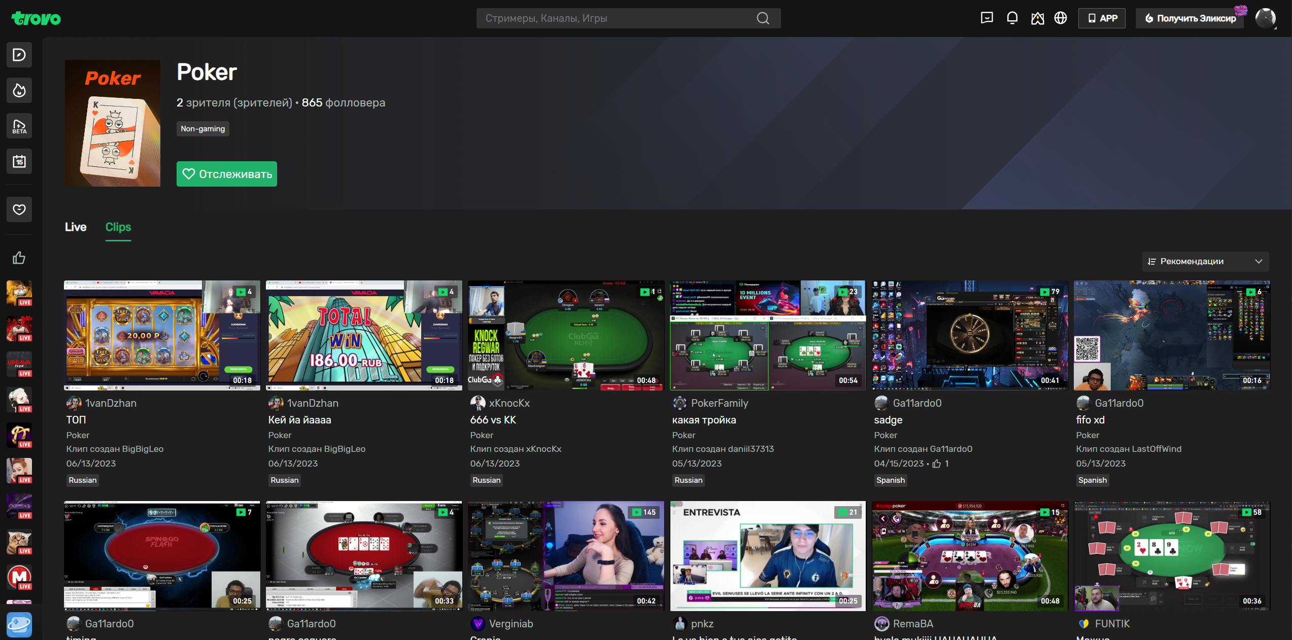 На 18:00 МСК 15 июня 2023 в категории «Poker» было всего 2 зрителя у одной активной трансляции и 865 фолловеров, а самый популярный клип имел 237 просмотров и 2 лайка.