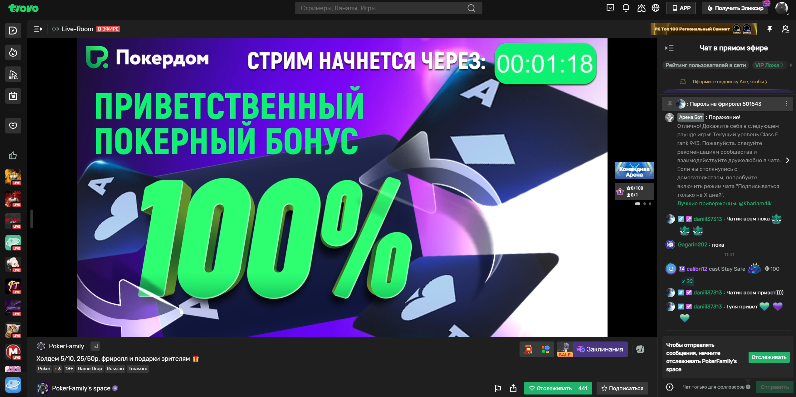 Кроме неё из популярных стримеров на Trovo можно найти команду Покердома — все три её участника выходят в эфир через одно пространство Poker Family.