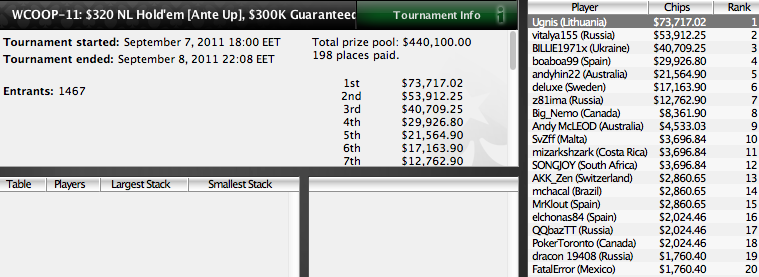 Россиянин "vitalya155" уступил в решающем хедс-апе WCOOP-11 игроку из Литвы с ником "Ugnis". Третье место занял украинец Billie1971x, а 7 место досталось другому россиянину z81ima. Тем не менее, мы вновь остались без победы, уже второй день подряд. Победа была очень близко, но главный приз в размере $73,717 и браслет WCOOP отправятся в Литву.