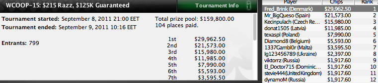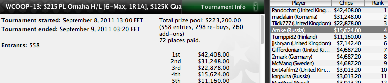 Недоехали мы и в WCOOP-13 (PLO 8 1R/1A). В данном турнире четвертое место занял обладатель браслета WSOP 2011 и чемпион SCOOP 2011 Вячеслав "Amke" Жуков, получив $15,624. В данном турнире отметился россиянин karpusha (11 место) и fever4ever (15 место).