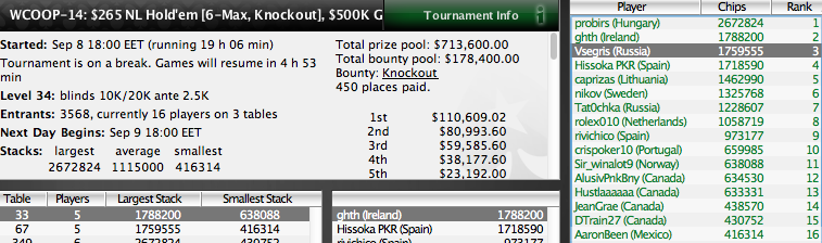 Зато сегодня вечером будет интересный финал WCOOP-14 (NLHE 6-max knockout). Во второй день прошли 16 игроков, среди которых россиянин Vsegris (3 место по фишкам) и Tat0chka (7 по фишкам). Желаем Татьяне успеха, шансы на главный приз в $110,609 весьма неплохие.