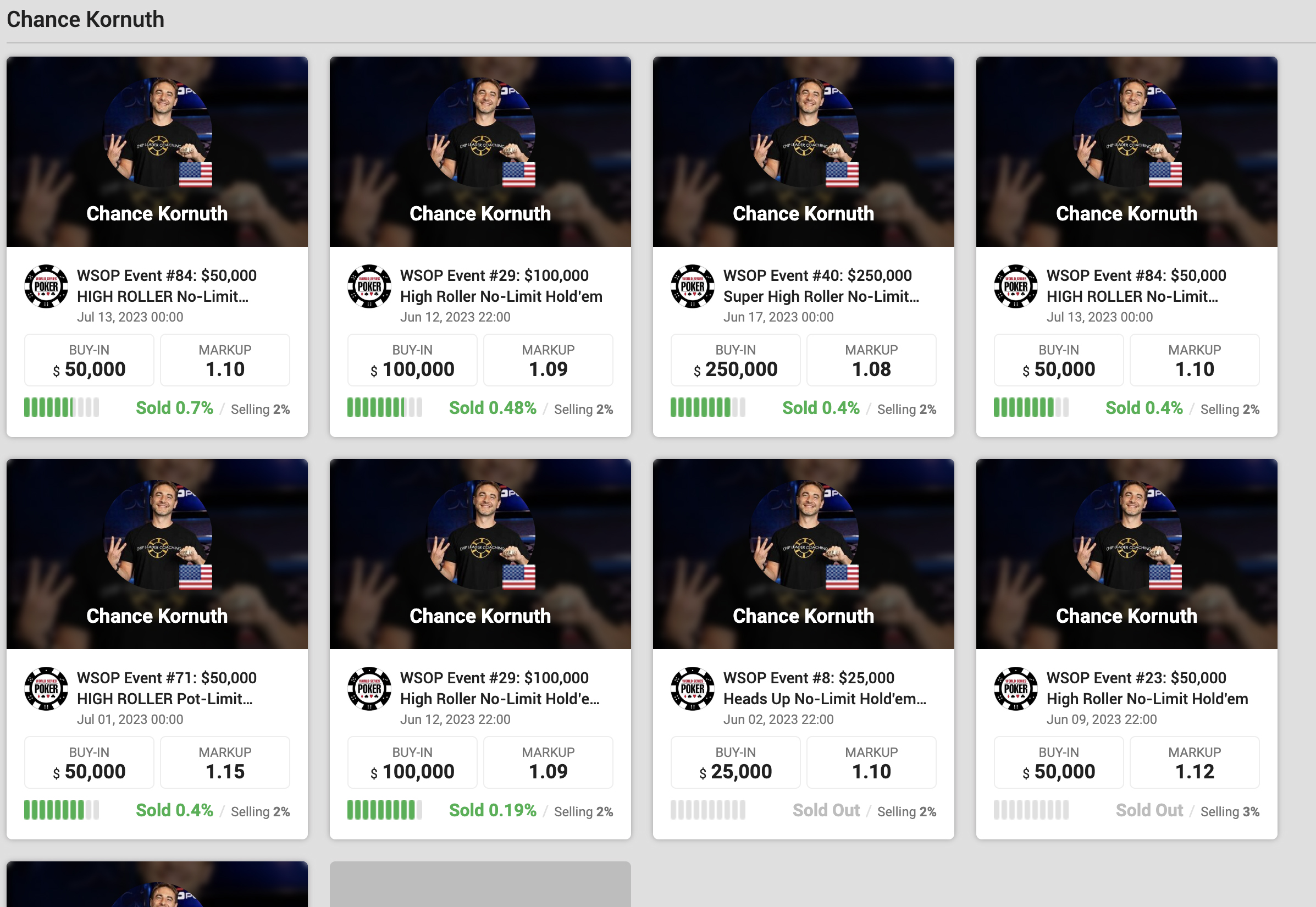 Долю можно покупать как в конкретном турнире, так и сразу в нескольких. Кэф при покупке долей от 1,1 до 1,5 в зависимости от дисциплины и бай-ина.