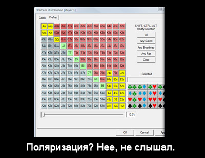 В стодевятом выпуске подкаста Deuce Plays эта идея была сформулирована товарищем Baluga Whale. На словах всё просто, но эффект просто поразительный, после того как фолдишь AJ на трибет без позиции на протяжении нескольких сотен тысяч раздач. Тем не менее, если есть уверенность в том, что диапазон оппонента чётко поляризован, то можно со спокойной душой коллировать его с руками типа KQ и AJ, будучи впереди его диапазона в 2/3 случаев. Вопрос же заключается в том, как всё это правильно сбалансировать..
