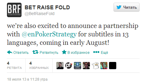 Документальный фильм об истории онлайн покера, вышедший месяц назад, Bet Raise Fold: The Story Of Online Poker будет переведён на 13 языков (субтитрами). Всё это произойдёт благодаря партнёрскому договору создателей картины с PokerStrategy (которых, кстати, недавно купили iPoker).