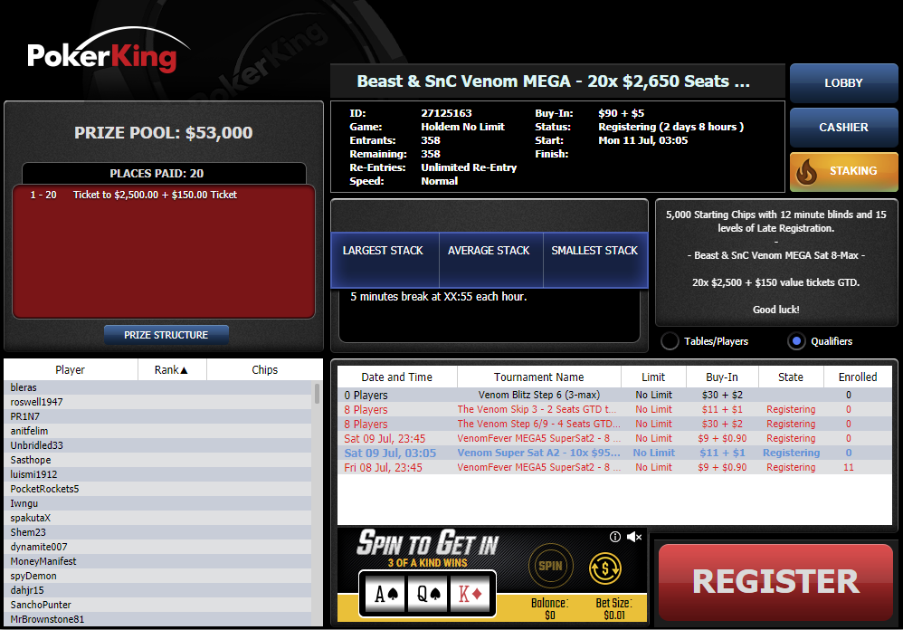 В лобби PokerKing уже можно найти массу прямых сателлитов на The Venom $10M с бай-ином от $32. Но, как всегда, с точки зрения бай-ина и гарантии самым выгодным вложением остаются саты $95 Beast & SnC MEGA, где разыгрывается по 20 билетов. Ближайший такой в ночь с 10 на 11 июля в 01:05 МСК.