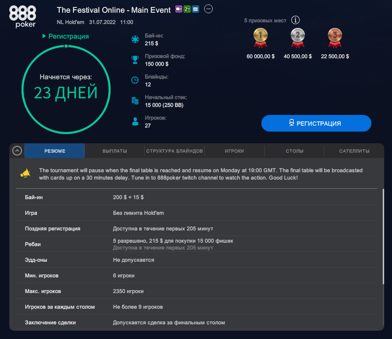 Главное событие с бай-ином $215 имеет относительно щедрую для 888poker гарантию $150,000. Причем оно пройдёт с одним входным днём, а не несколькими, как зачастую бывает. Самый выгодный сателлит в Main Event состоится 28 июля — в нём разыграют 50 билетов по $215.