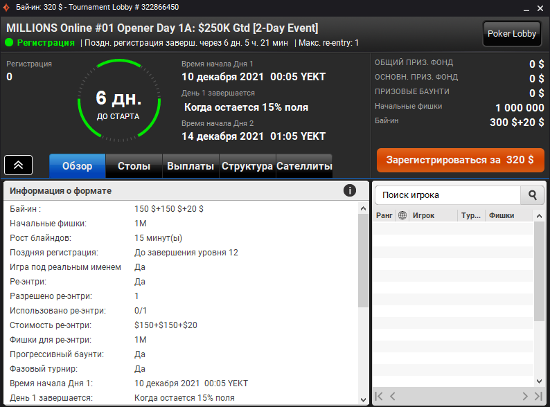 | 12-30 декабря | #05 partypoker Championship | $1050 | $1M |
