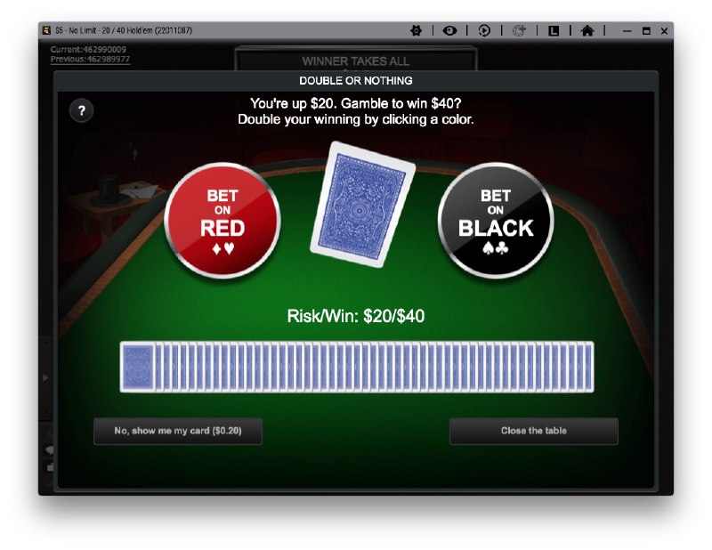 Эта статья не появилась бы, если бы пользователи не заметили одну очень интересную игру. На PokerKing сразу после заноса в Jackpots (турнир Spin&Go) появляется окошко: «Вот твои $20. Но как насчет погемблить и выиграть $40. Угадай цвет».