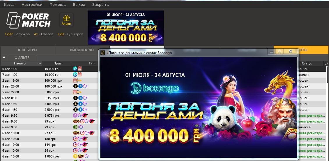 PokerMatch славится огромным списком покерных акций, которые одновременно проходят в руме: Турниромания, дневник регуляра, легкие деньги, летний спринт и т.д. Но сейчас, вероятно, рум потихоньку смещает акцент с покера на игры казино. При запуске рума встречает реклама погони за деньгами, а в самом лобби вкладка «Слоты» почему-то выделена другим, более ярким цветом. Короче говоря, PokerMatch потихонечку открывает окно Овертона. Надеемся, что через год-другой вкладка «Покер» не попадет в скрытое меню на сайте.