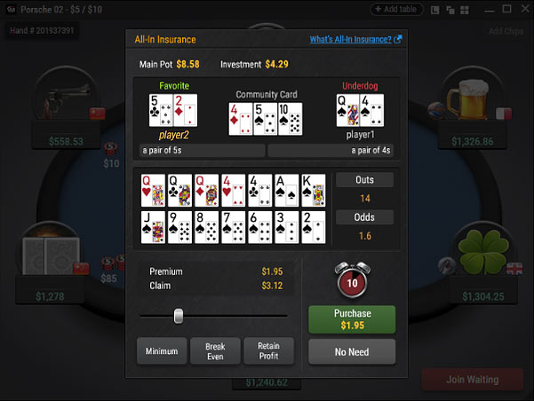 Летом 2019 на PokerStars появилась функция «All-in Cash Out». Страховка олл-ина (тема, которая развивалась в закрытых китайских приложениях) перекочевала на мировую платформу. Игроки пытались посчитать, выгодно ли продавать своё эквити, но в итоге пришли к выводу, что наибольший профит от этого получит рум.