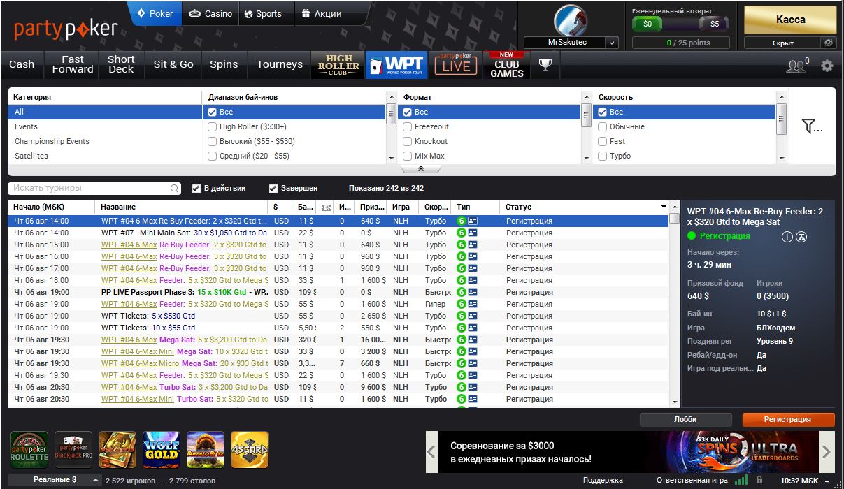 К partypoker практически не было претензий. Рум рекламирует покер, не внедряет в покерные акции казиношные миссии, не делает акцент на слотах. Но есть одно но. На partypoker слоты запускаются быстрее, чем в любом другом руме. Всё из-за маленьких иконок в самом низу главной страницы. На какую бы ты вкладку не перешёл, с любой можно поиграть в блекджек, половить книжки или погонять волка по слоту.
