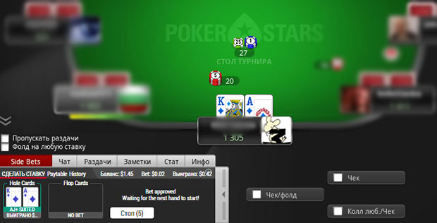 «Side Bets» — пари на PokerStars, в которых игрок за 2, 5 и 10 центов ставит на пул возможных исходов (что на руки придет пара Тузов, Туз с картинкой или карманаая пара, а на флопе положат стрит-флеш, сет, стрит, флэш или пару). Забавно, что Side Bets запустились, невзирая на блокировку всех азартных игр в руме.