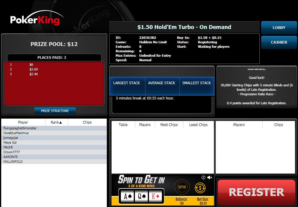 Другая тема — слот прямо в лобби турнира. Играешь, ловишь сет — получаешь билет в турнир. Можно крутить по центу, доллару и $0.25. Самое забавное, что PokerKing пишут: «Вместо 10% типичного рейка в сателлитах в Spin to Get IN рейк только 2%. Выплаты в 98% случаев!»