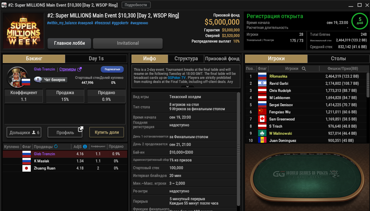 - 14, 16, 18 и 19 сентября в 21:00 МСК — $10,300 Super MILLION$ Main Event $5M GTD