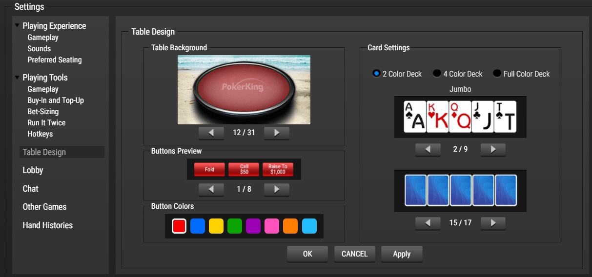 Во-вторых, появился новый дизайн кнопок и колоды. Для тех, кто любит красивое оформление, разработчики PokerKing добавили 8 вариантов кнопок действий, шесть новых типов оформления колоды в трёх цветовых схемах (двух, четырех и полноцветной) и новые фоны для индивидуальных столов. Найти их можно в Settings —> Table Design.