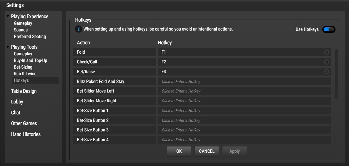 Базовыми заданы Фолд (F1), Чек / Колл (F2) и Ставка / Рейз (F3). Остальные действия, в том числе отдельно для Blitz Poker (аналог ZOOM), можно поставить на удобные для игрока клавиши, правую кнопку мыши и колесико. Однако, пока под горячие клавиши нельзя использовать левую кнопку мыши и цифровую панель клавиатуры (Numpad).