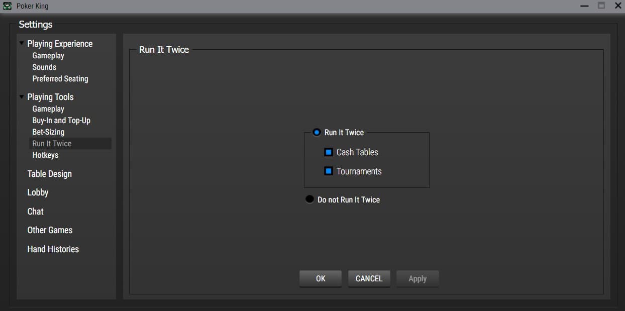 И вот сеть решила нарушить паттерн и ввести у себя RIT сразу для кеша и МТТ. Теперь, чтобы иметь возможность выбрать количество выкладок борда, игрокам нужно включить функцию, пройдя путь Settings (Настройки) —> Playing Tools (Игровые инструменты) —> Run It Twice.