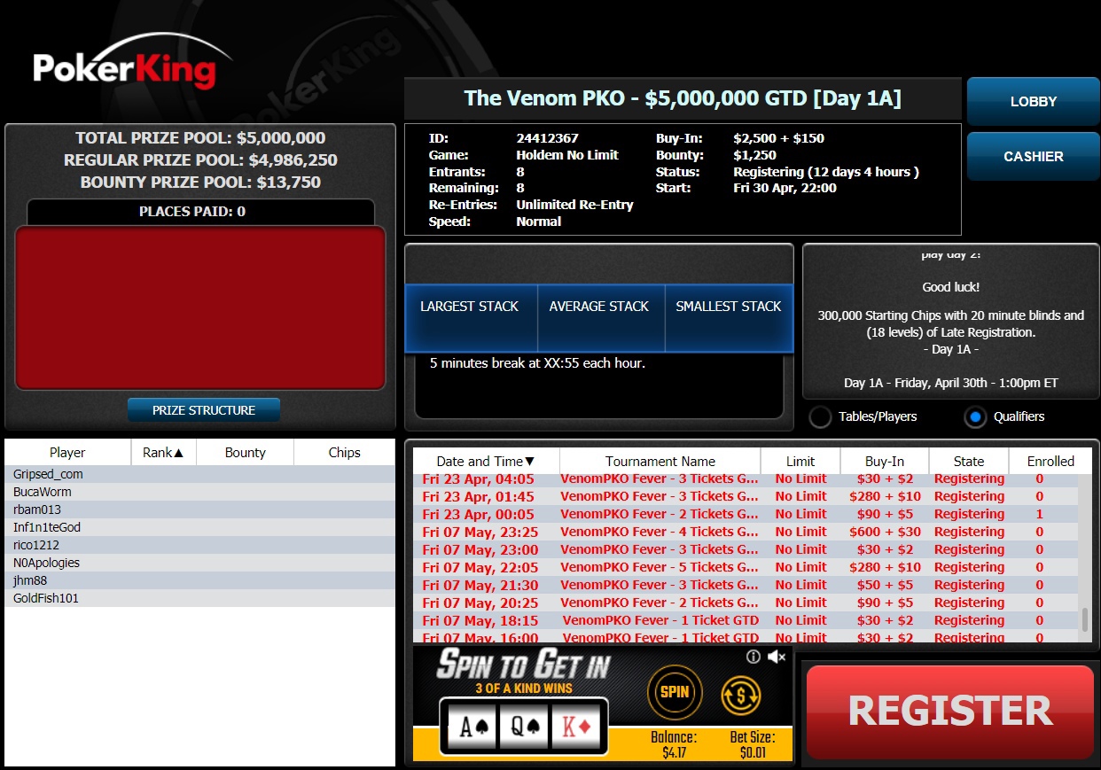 С 30 апреля по 12 мая на PokerKing пройдёт очередной The Venom — в этот раз с гарантией на $3M меньше, чем в январе — феврале. Грядущий турнир пройдёт в три игровых дня.