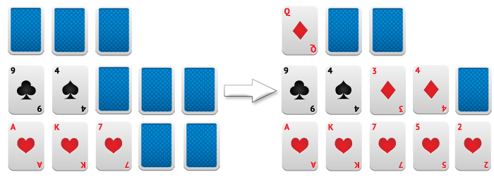 Вместо этого, вам лучше отправить двойку вниз (ПОМЕТКА: при условии, если вы ходите первым), тем самым дав себе шанс на очень сильные комбинации – каре или фулхаус (по 3 аута на валет и двойку, в общем = 6). Кроме хорошего потенциального роялти, вы также даёте карте реализоваться в нижней позиции, нежели бесполезно потеряться где-нибудь сверху или в середине. Следующим плюсом станет король в средней позиции – все эти, вроде бы мелкие нюансы дают вам руку с очень хорошим потенциалом набора кушей и скупа оппонента. То есть, если вы усвоили эту простую теорию, то скорее будете расставлять такую стартовую руку следующим образом
