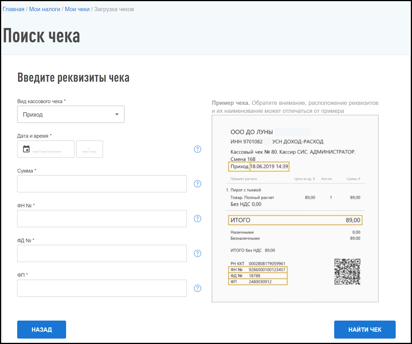 Примечательно, что раздел «Мои чеки» есть и в личном кабинете налогоплательщика — его можно найти во вкладке «Налоги», нажав на кнопку «Кассовые чеки». Однако, там никакой информации по ваши платежам нет — надо вносить реквизиты каждого чека вручную самостоятельно, только тогда ФНС сможет найти его в системе.