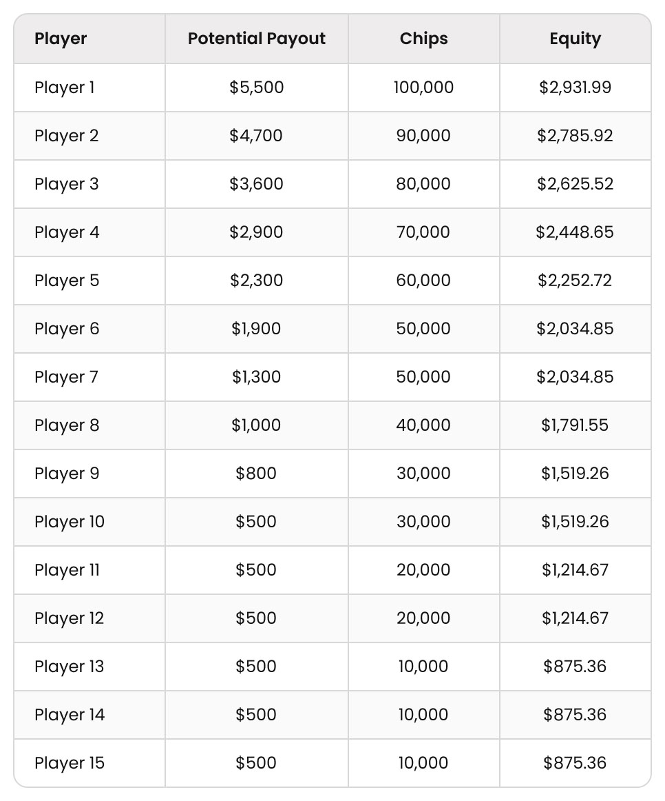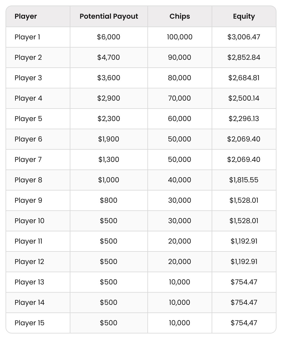 Представим, что есть турнир за $200. В игре осталось 15 участников. Ниже в таблице представлены размеры выплат, стеки и эквити этих стеков на текущий момент в турнире.