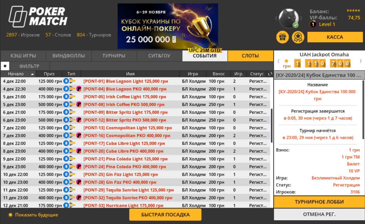 - Пот-Лимитная Омаха — 23 ивента с бай-инами 200 и 1К и гарантиями 50К и 500К гривен.