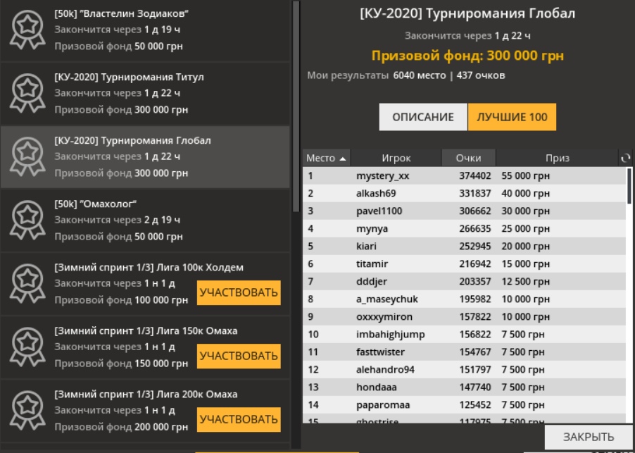 - Безлимитный Холдем — 48 ивентов с бай-инами 100, 200 и 500 и гарантиями от 125К до 2М гривен. Половина турниров — в формате PKO.