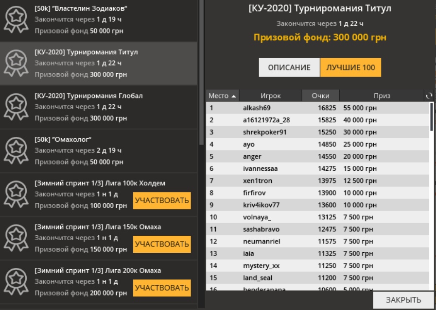| Лига 200К | 25 / 50 и выше | 200К гривен |