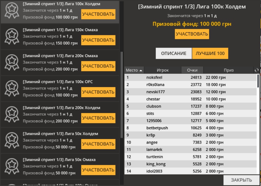 Для Холдема и Омахи рум ввел специальные Лиги — отдельные рейтинги по лимитам с разными призовыми фондами: