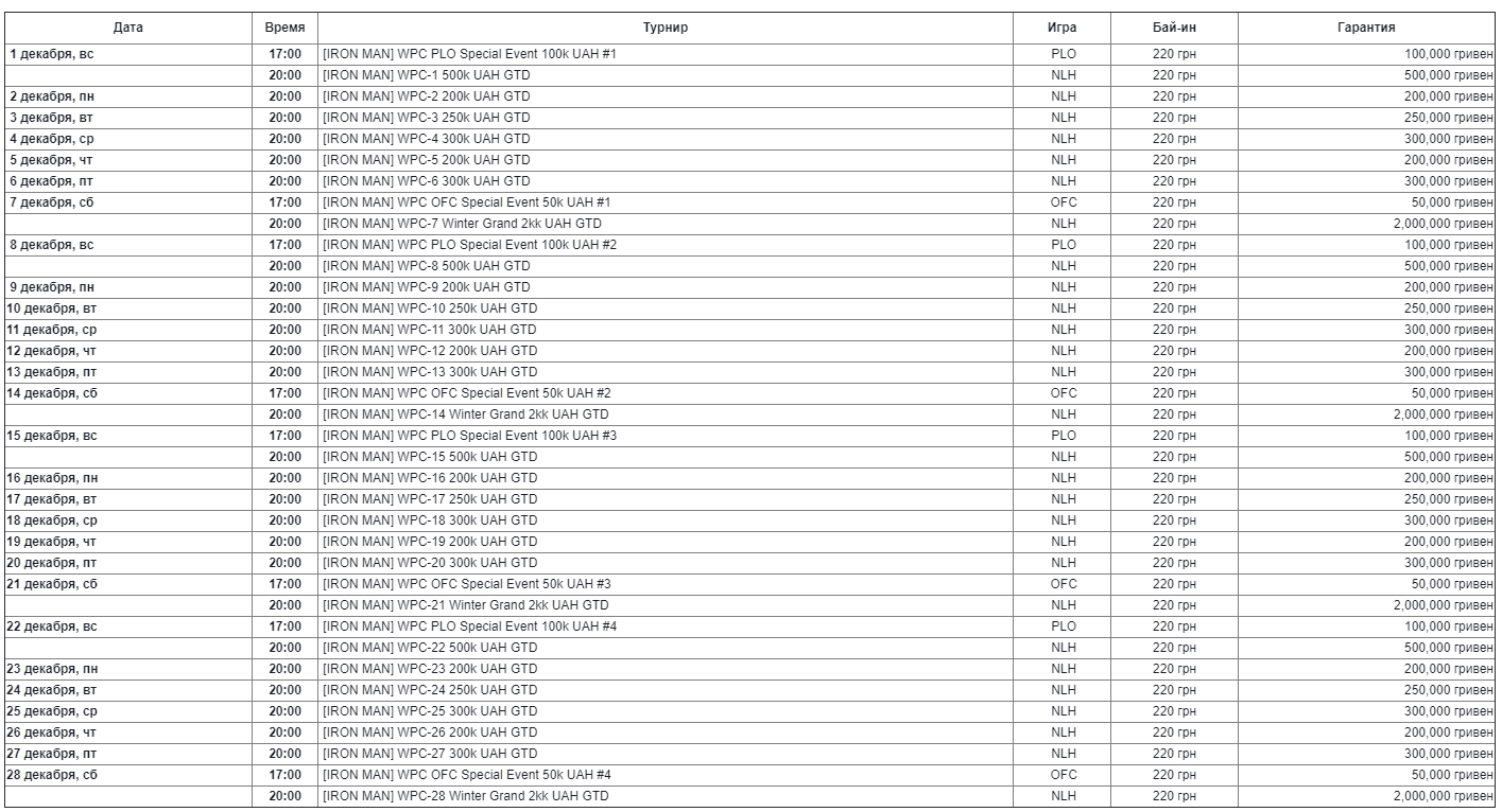 В расписании серии Winter Poker Cup (WPC) есть турниры по Холдему, Омахе и Ананасу, гарантии до 2 миллионов Гривен (более $80K по курсу).