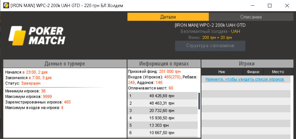 За правильно сделанный депозит ПокерМатч добавит к вашему счету 220 гривен, на которые вы можете сыграть один из турниров Winter Poker Cup. Имейте ввиду, что турниры проходят с ребаями и адд-онами, поэтому лучше иметь на счету запас в несколько бай-инов.